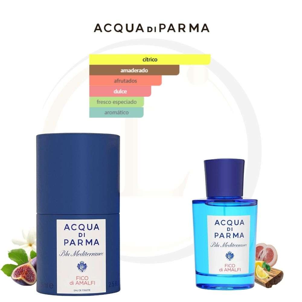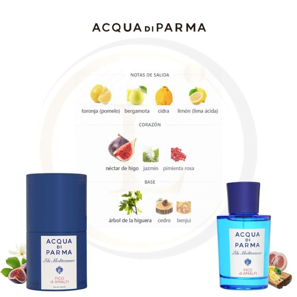 Acqua di Parma Blu Mediterraneo – Fico di Amalfi de Acqua di Parma es una fragancia de la familia olfativa Floral Frutal para Hombres y Mujeres. Acqua di Parma Blu Mediterraneo – Fico di Amalfi se lanzó en 2006. Las Notas de Salida son toronja (pomelo), bergamota, cidra y limón (lima ácida); las Notas de Corazón son néctar de higo, jazmín y pimienta rosa; las Notas de Fondo son árbol de la higuera, cedro y benjuí.