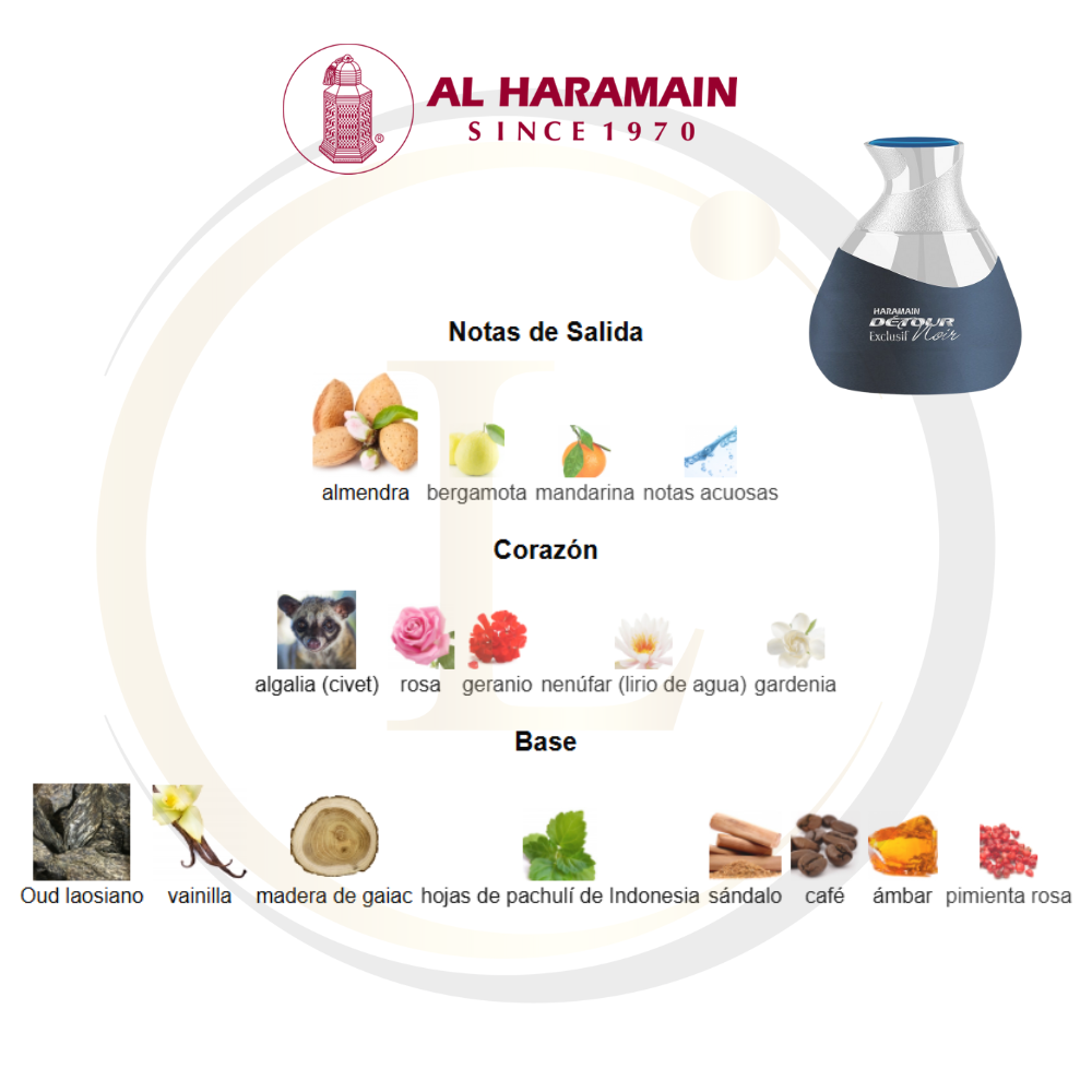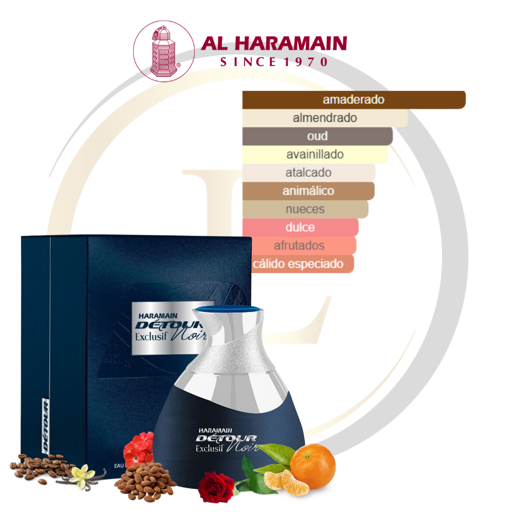 Detour Noir Exclusif de Al Haramain Perfumes es una fragancia de la familia olfativa Oriental Floral para Hombres y Mujeres. Las Notas de Salida son almendra, bergamota, mandarina y notas acuosas; las Notas de Corazón son algalia (civet), rosa, geranio, nenúfar (lirio de agua) y gardenia; las Notas de Fondo son Oud laosiano, vainilla, madera de gaiac, hojas de pachulí de Indonesia, sándalo, café, ámbar, pimienta rosa y musgo de roble.