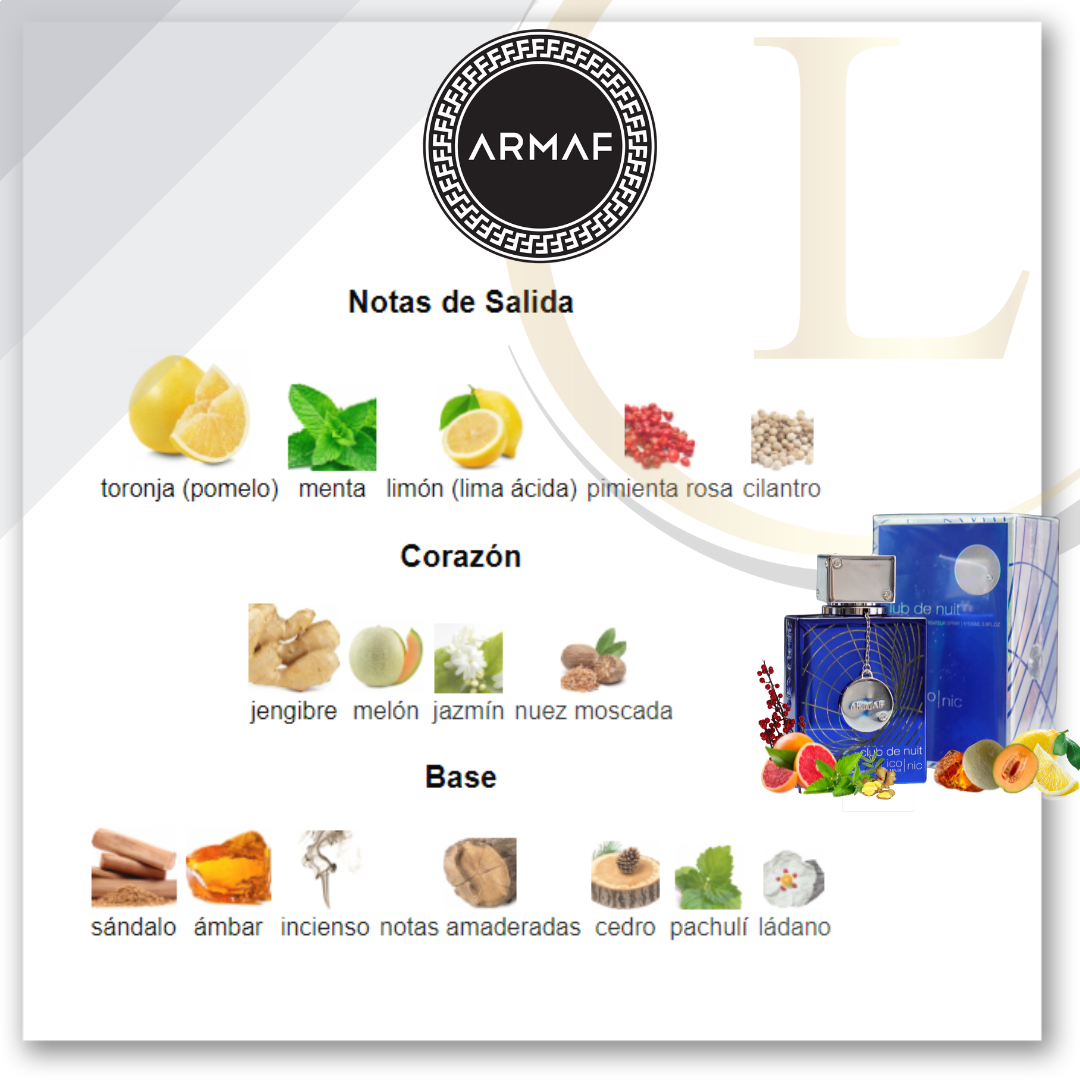 Club de Nuit Blue Iconic de Armaf es una fragancia de la familia olfativa para Hombres. Esta fragrancia es nueva. Club de Nuit Blue Iconic se lanzó en 2022. Las Notas de Salida son toronja (pomelo), menta, limón (lima ácida), pimienta rosa y cilantro; las Notas de Corazón son jengibre, melón, jazmín y nuez moscada; las Notas de Fondo son sándalo, ámbar, incienso, notas amaderadas, cedro, pachulí y ládano.