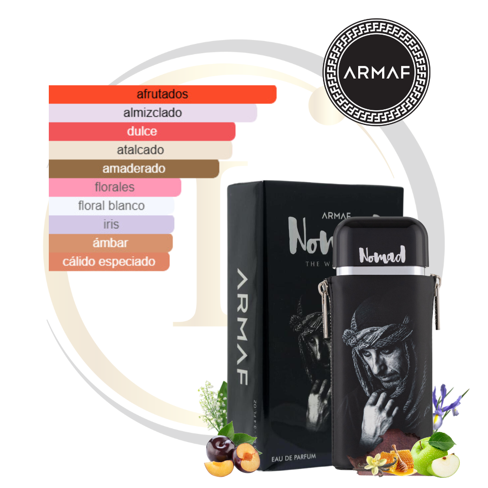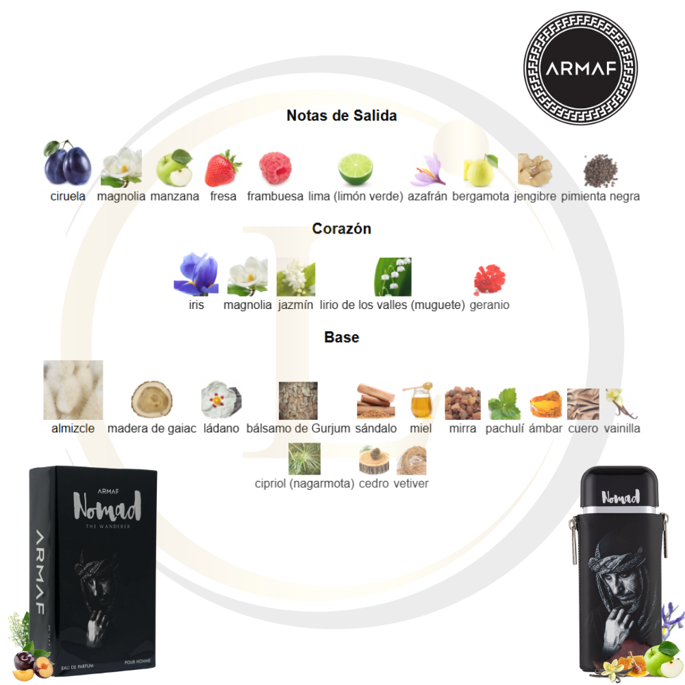 Nomad Pour Homme de Armaf es una fragancia de la familia olfativa para Hombres. Esta fragrancia es nueva. Nomad Pour Homme se lanzó en 2022. Las Notas de Salida son ciruela, magnolia, manzana, fresa, frambuesa, lima (limón verde), azafrán, bergamota, jengibre y pimienta negra; las Notas de Corazón son iris, magnolia, jazmín, lirio de los valles (muguete) y geranio; las Notas de Fondo son almizcle, madera de gaiac, ládano, bálsamo de Gurjum, sándalo, miel, mirra, pachulí, ámbar, cuero, vainilla, cipriol (nagarmota), cedro y vetiver.