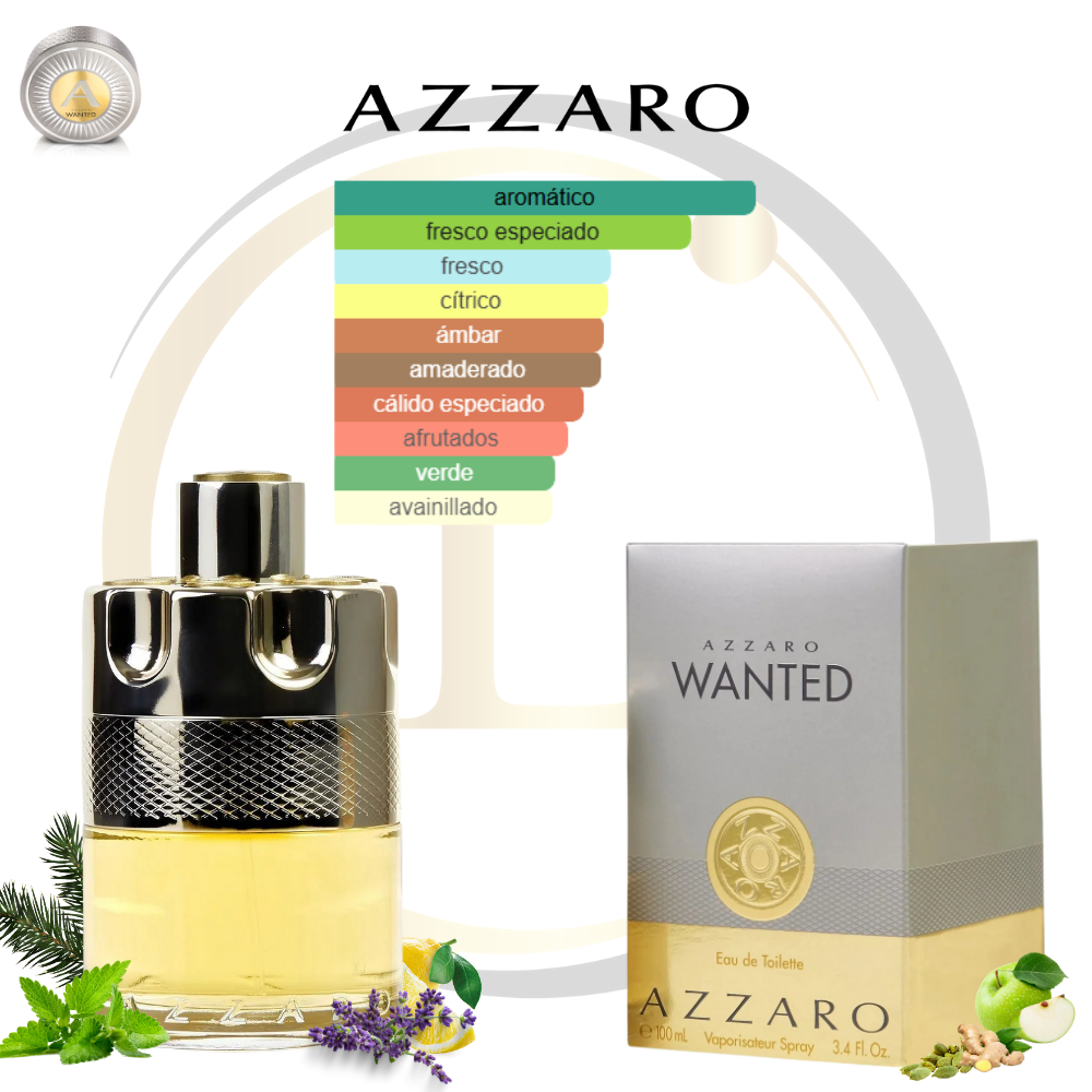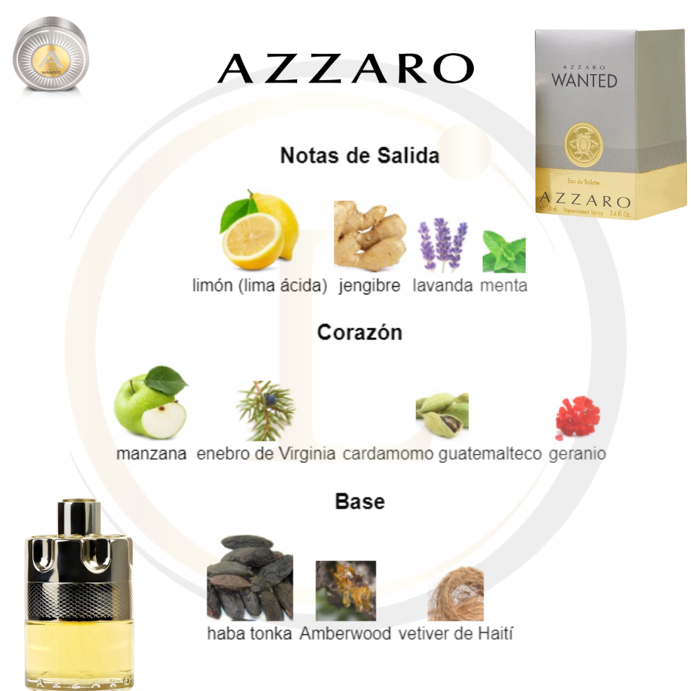 Wanted de Azzaro es una fragancia de la familia olfativa Amaderada Especiada para Hombres. Wanted se lanzó en 2016. Wanted fue creada por Fabrice Pellegrin y Olivier Cresp. Las Notas de Salida son limón (lima ácida), jengibre, lavanda y menta; las Notas de Corazón son manzana, cardamomo guatemalteco, enebro de Virginia y geranio; las Notas de Fondo son haba tonka, Amberwood y vetiver de Haití.