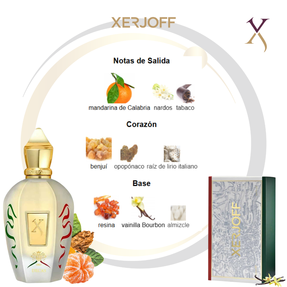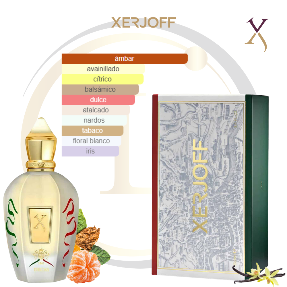 XJ 1861 Decas de Xerjoff es una fragancia de la familia olfativa Oriental Floral para Hombres y Mujeres. XJ 1861 Decas se lanzó en 2021. La Nariz detrás de esta fragrancia es Chris Maurice. Las Notas de Salida son mandarina de Calabria, nardos y tabaco; las Notas de Corazón son benjuí, opopónaco y raíz de lirio italiano; las Notas de Fondo son resina, vainilla Bourbon y almizcle.