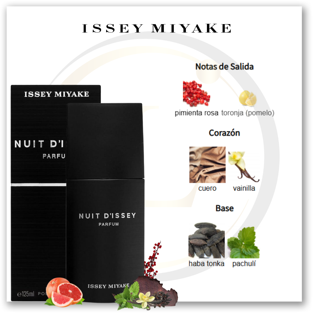 Nuit d’Issey Parfum de Issey Miyake es una fragancia de la familia olfativa Amaderada Especiada para Hombres. Nuit d’Issey Parfum se lanzó en 2015. Las Notas de Salida son pimienta rosa y toronja (pomelo); las Notas de Corazón son cuero y vainilla; las Notas de Fondo son haba tonka y pachulí.