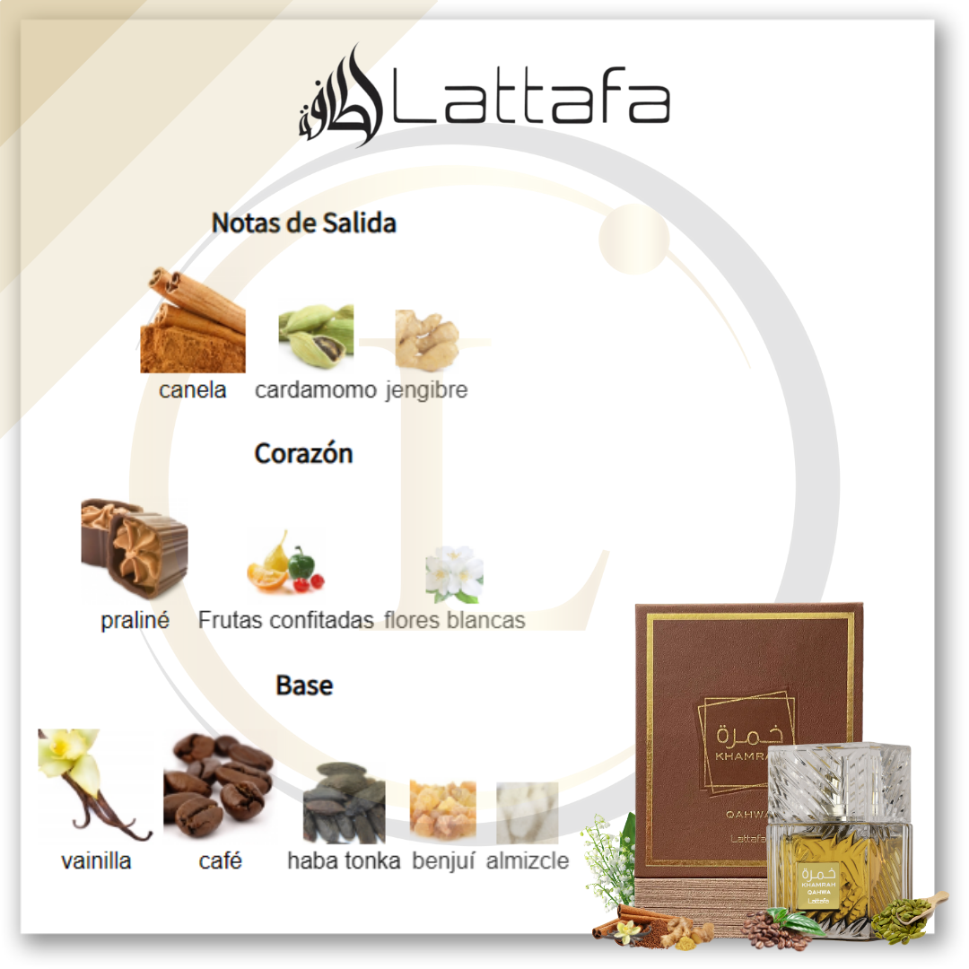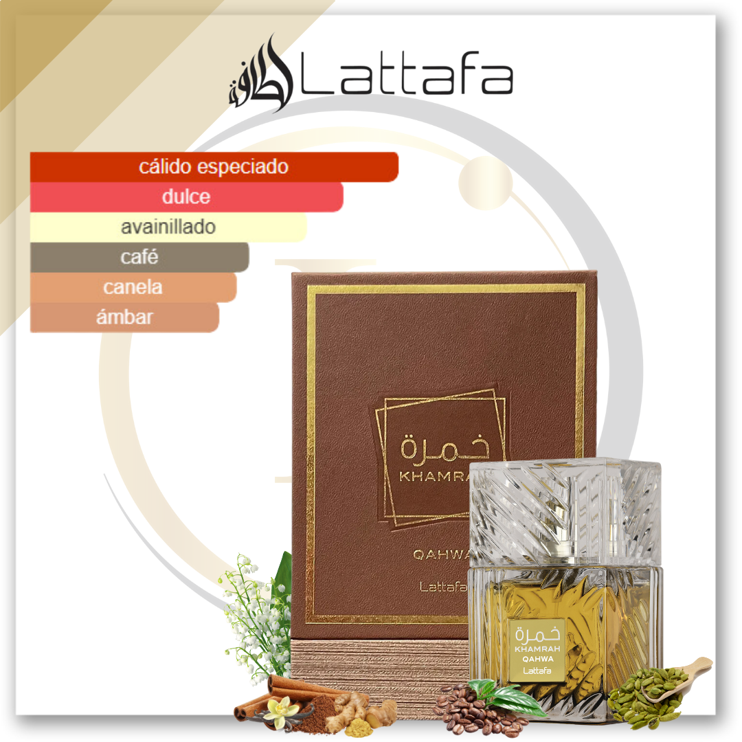 Khamrah Qahwa de Lattafa Perfumes es una fragancia de la familia olfativa para Hombres y Mujeres. Esta fragrancia es nueva. Khamrah Qahwa se lanzó en 2023. Las Notas de Salida son canela, cardamomo y jengibre; las Notas de Corazón son praliné, Frutas confitadas y flores blancas; las Notas de Fondo son vainilla, café, haba tonka, benjuí y almizcle.