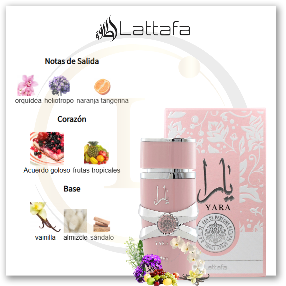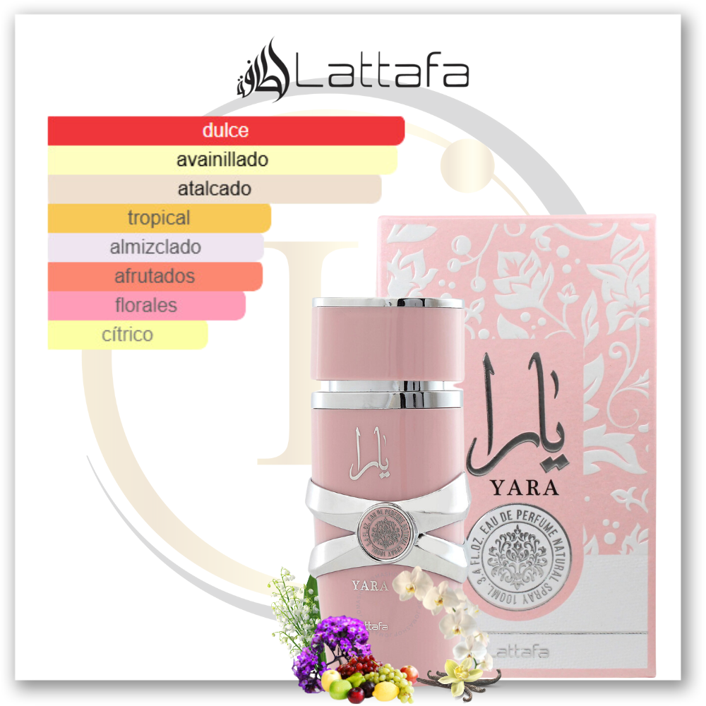 Yara de Lattafa Perfumes es una fragancia de la familia olfativa Ámbar Vainilla para Mujeres. Yara se lanzó en 2020. Las Notas de Salida son orquídea, heliotropo y naranja tangerina; las Notas de Corazón son Acuerdo goloso y frutas tropicales; las Notas de Fondo son vainilla, almizcle y sándalo.