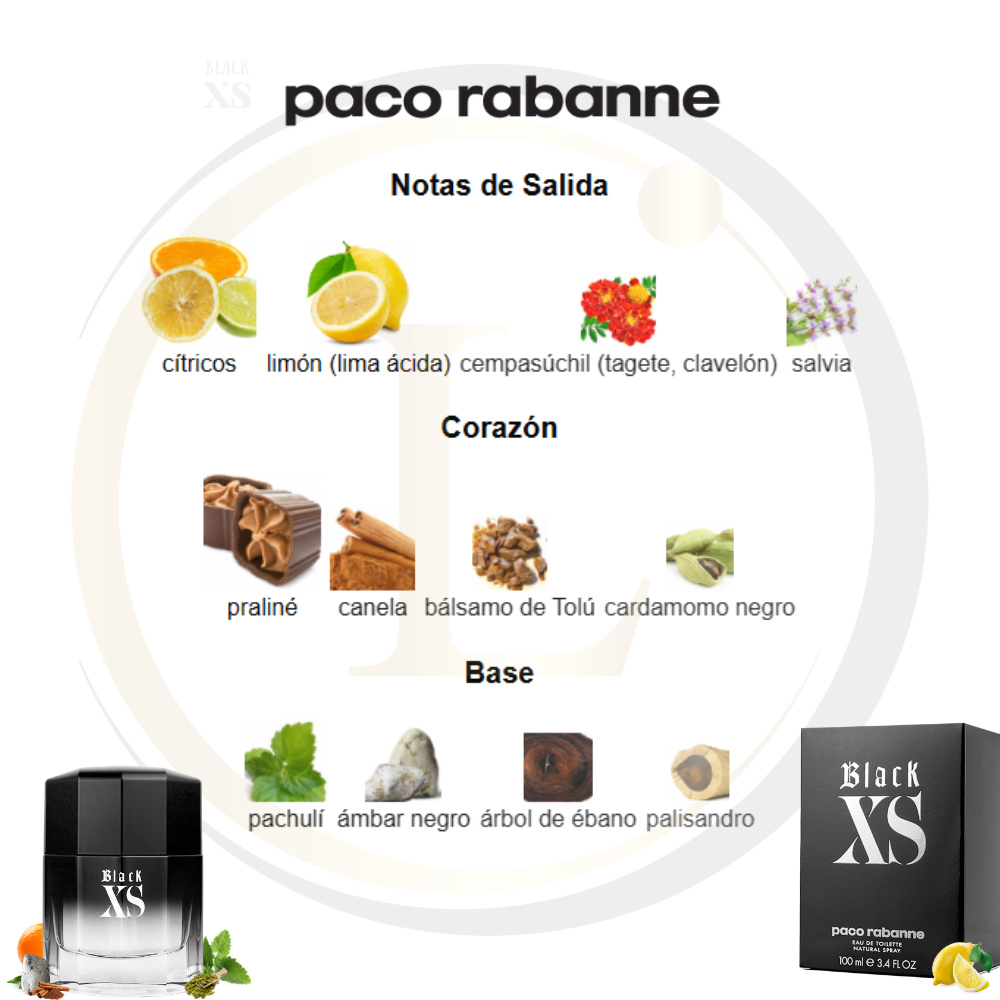 Black XS (2018) de Paco Rabanne es una fragancia de la familia olfativa Ámbar Amaderada para Hombres. Black XS (2018) se lanzó en 2018. Black XS (2018) fue creada por Olivier Cresp y Rosendo Mateu. Las Notas de Salida son cítricos, limón (lima ácida), cempasúchil (tagete, clavelón) y salvia; las Notas de Corazón son praliné, canela, bálsamo de Tolú y cardamomo negro; las Notas de Fondo son pachulí, ámbar negro, árbol de ébano y palisandro.
