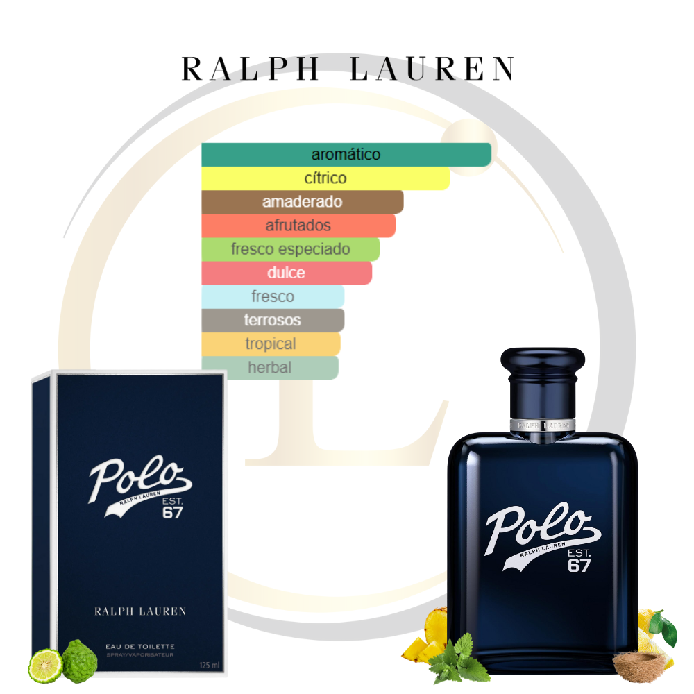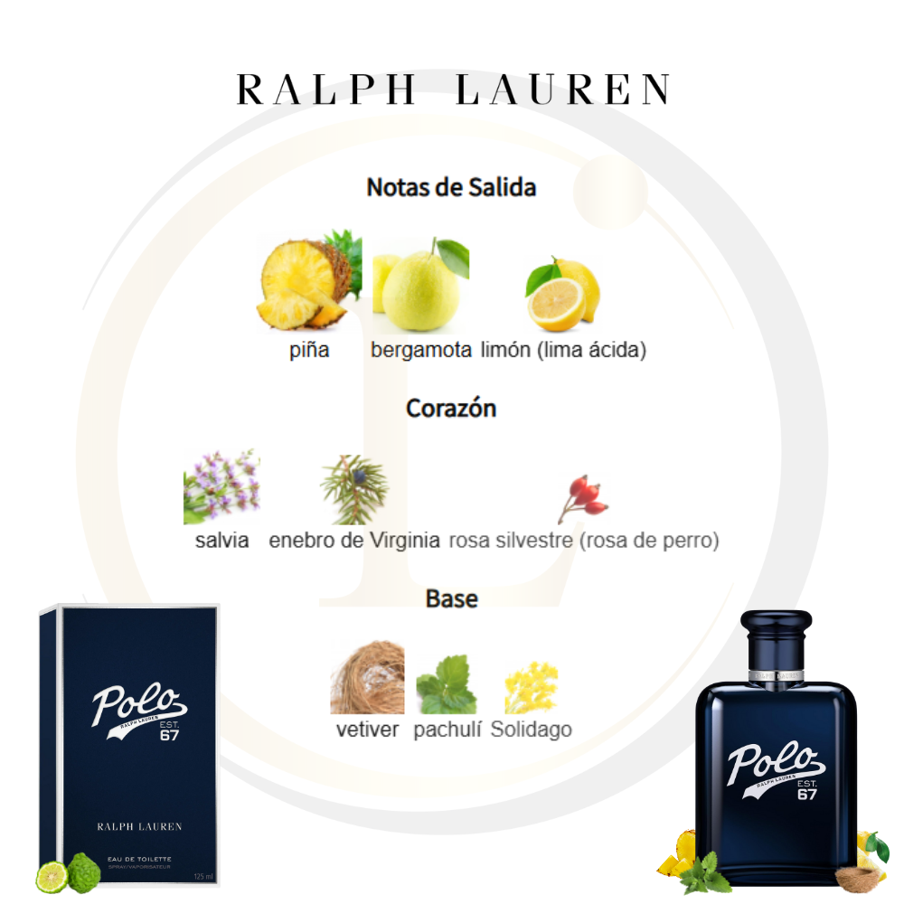 Polo 67 de Ralph Lauren es una fragancia de la familia olfativa Amaderada Aromática para Hombres. Esta fragrancia es nueva. Polo 67 se lanzó en 2024. La Nariz detrás de esta fragrancia es Marie Salamagne. Las Notas de Salida son piña, bergamota y limón (lima ácida); las Notas de Corazón son salvia, enebro de Virginia y rosa silvestre (rosa de perro); las Notas de Fondo son vetiver, pachulí y Solidago.
