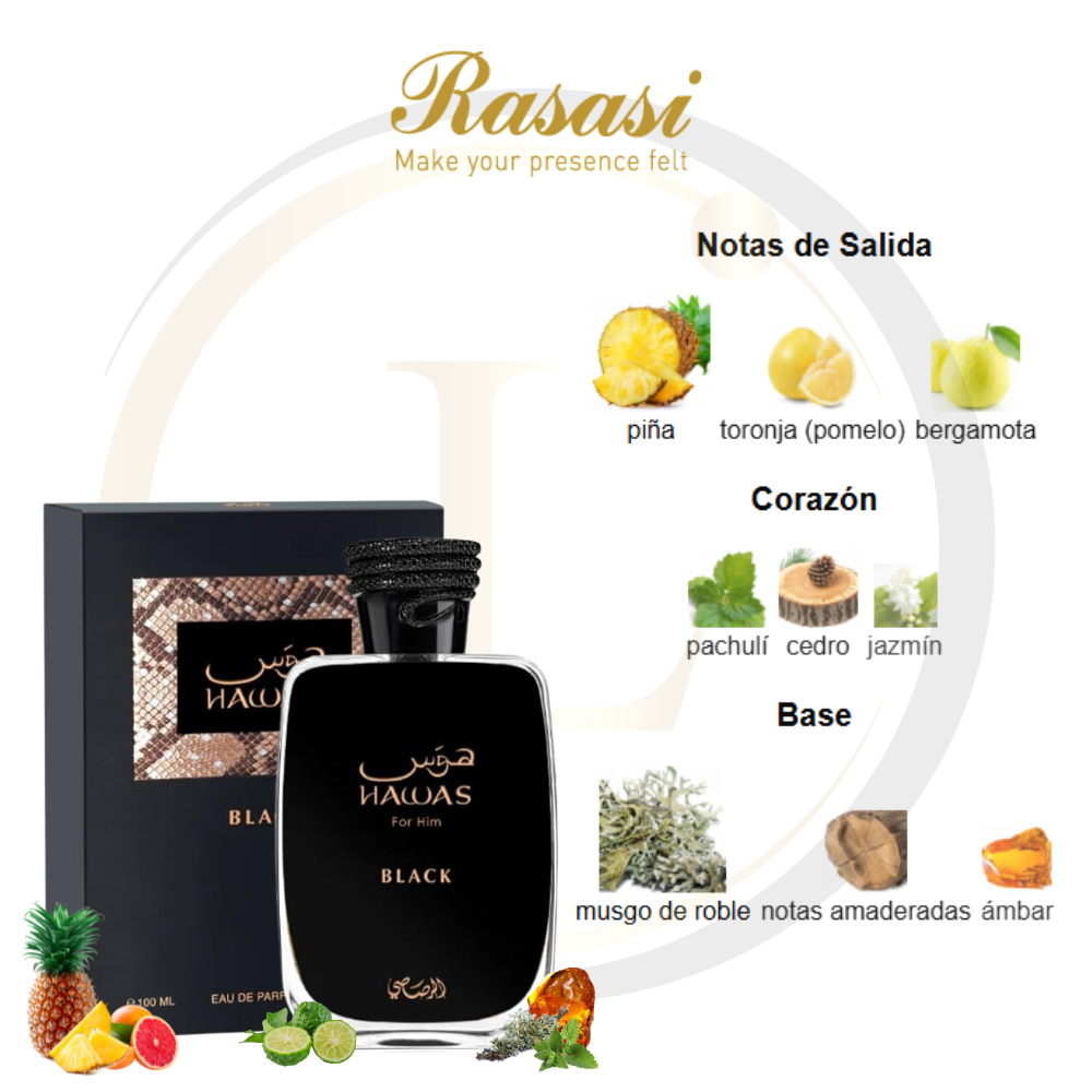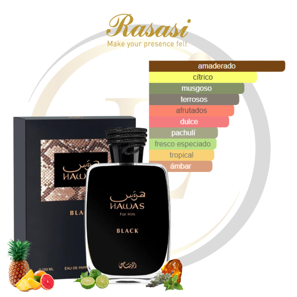 Hawas Black de Rasasi es una fragancia de la familia olfativa para Hombres. Esta fragrancia es nueva. Hawas Black se lanzó en 2024. Las Notas de Salida son piña, toronja (pomelo) y bergamota; las Notas de Corazón son pachulí, cedro y jazmín; las Notas de Fondo son musgo de roble, notas amaderadas y ámbar.