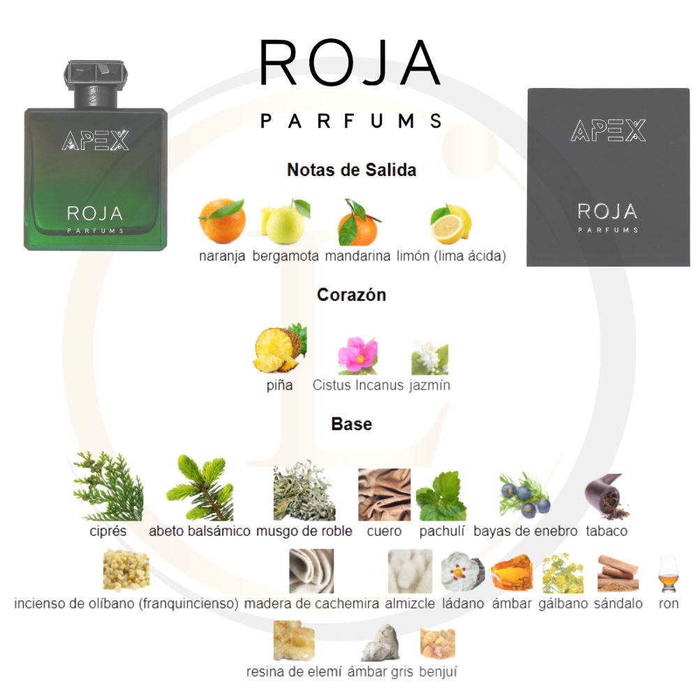 Apex de Roja Dove es una fragancia de la familia olfativa Cuero para Hombres. Esta fragrancia es nueva. Apex se lanzó en 2022. La Nariz detrás de esta fragrancia es Roja Dove. Las Notas de Salida son naranja, bergamota, mandarina y limón (lima ácida); las Notas de Corazón son piña, Cistus Incanus y jazmín; las Notas de Fondo son ciprés, abeto balsámico, musgo de roble, cuero, pachulí, bayas de enebro, tabaco, incienso de olíbano (franquincienso), madera de cachemira, almizcle, ládano, ámbar, gálbano, sándalo, ron, resina de elemí, ámbar gris y benjuí.