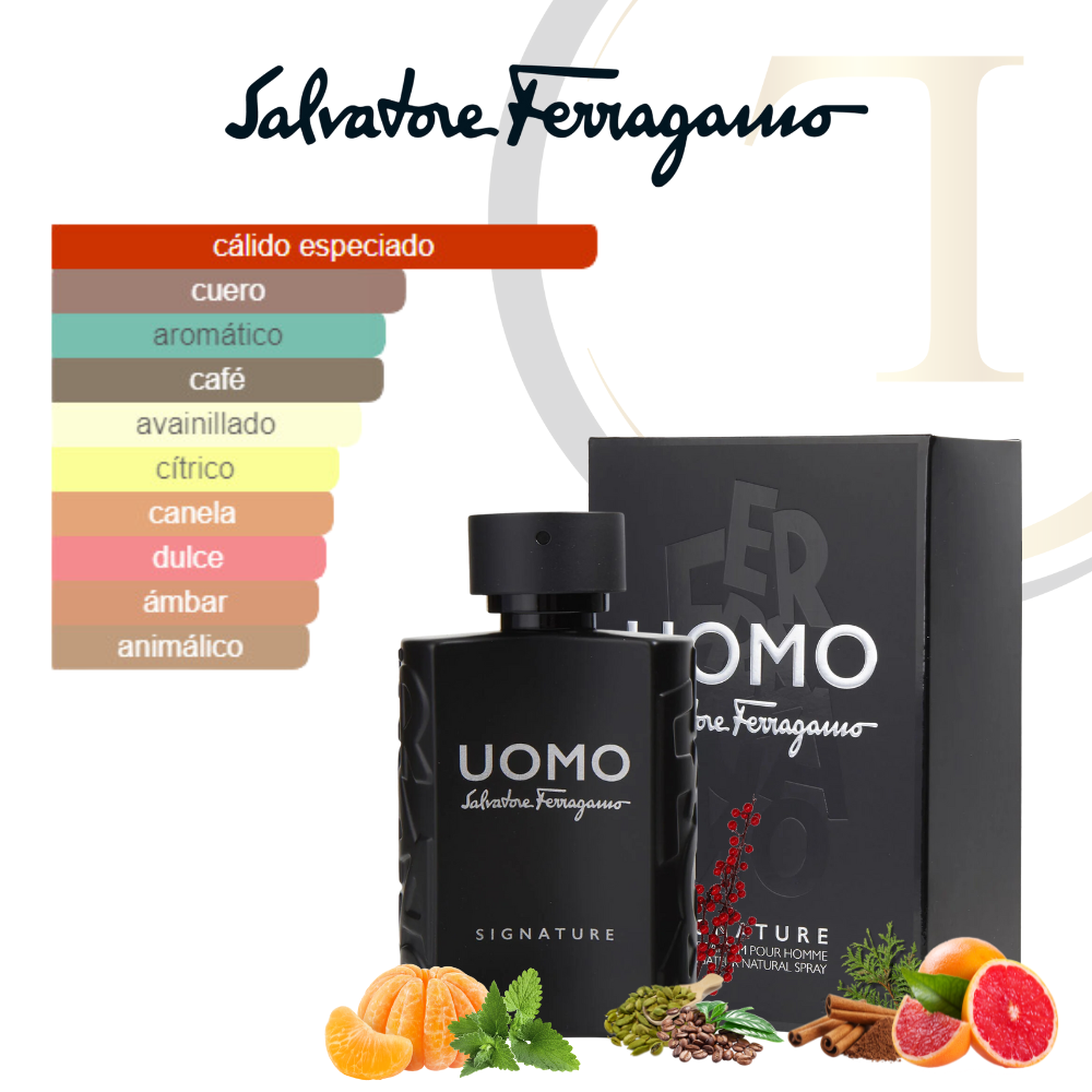 Uomo Salvatore Ferragamo Signature de Salvatore Ferragamo es una fragancia de la familia olfativa Cuero para Hombres. Uomo Salvatore Ferragamo Signature se lanzó en 2018. La Nariz detrás de esta fragrancia es Alberto Morillas. Las Notas de Salida son pimienta rosa, mandarina italiana y toronja (pomelo); las Notas de Corazón son canela, cardamomo y ciprés; las Notas de Fondo son haba tonka, cuero, granos de café tostado y pachulí.