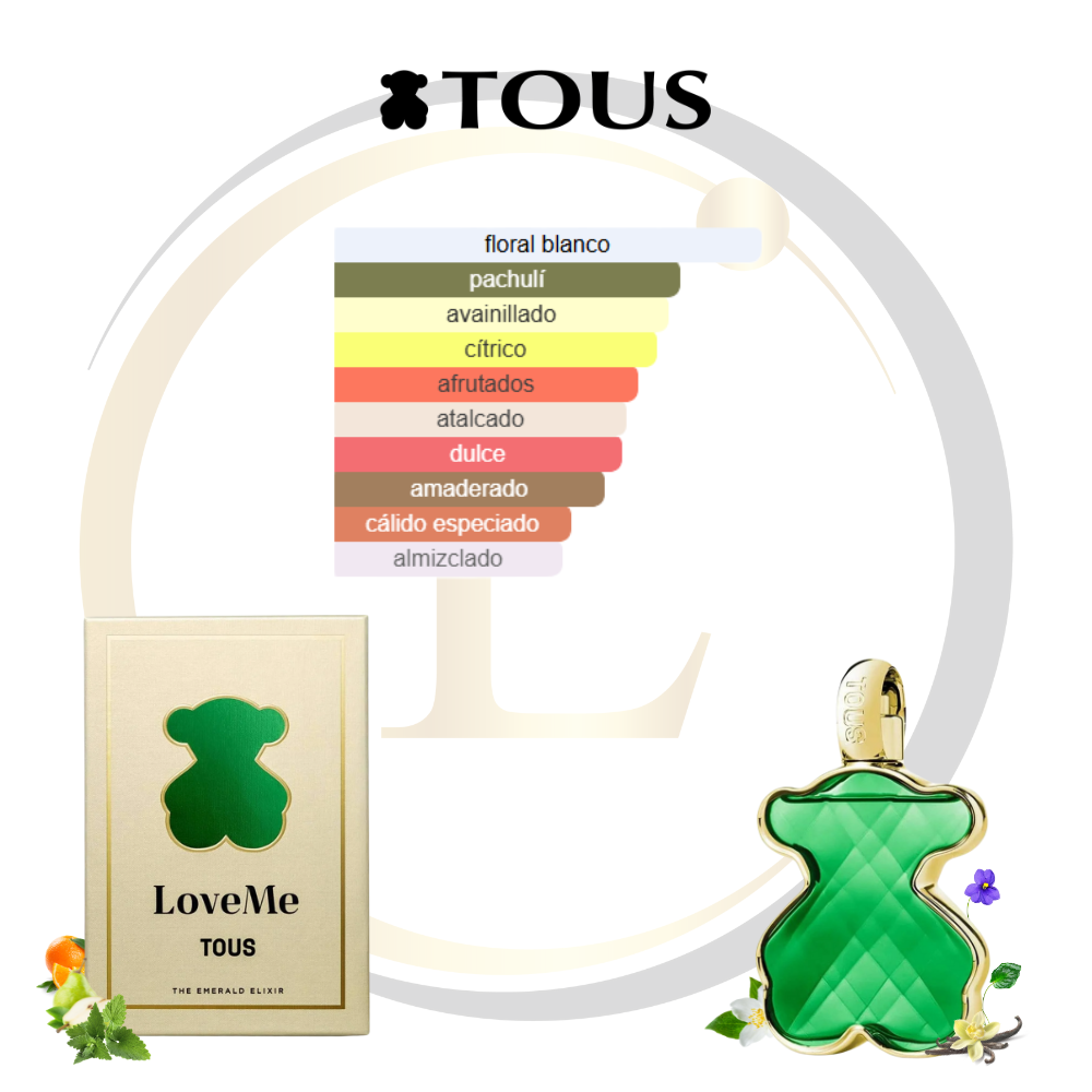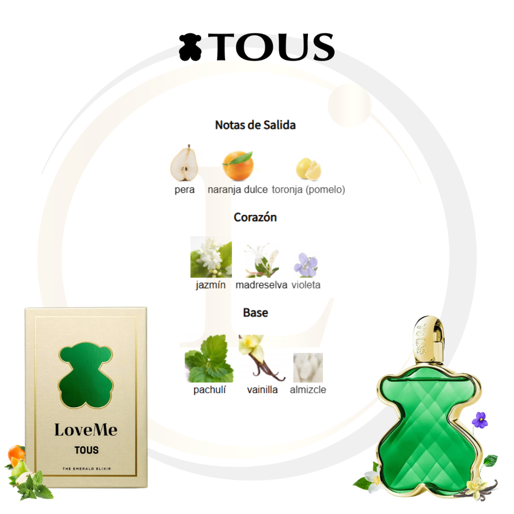 LoveMe The Emerald Elixir de Tous es una fragancia de la familia olfativa Oriental Floral para Mujeres. Esta fragrancia es nueva. LoveMe The Emerald Elixir se lanzó en 2023. La Nariz detrás de esta fragrancia es Dominique Ropion. Las Notas de Salida son pera, naranja dulce y toronja (pomelo); las Notas de Corazón son jazmín, madreselva y violeta; las Notas de Fondo son pachulí, vainilla y almizcle.