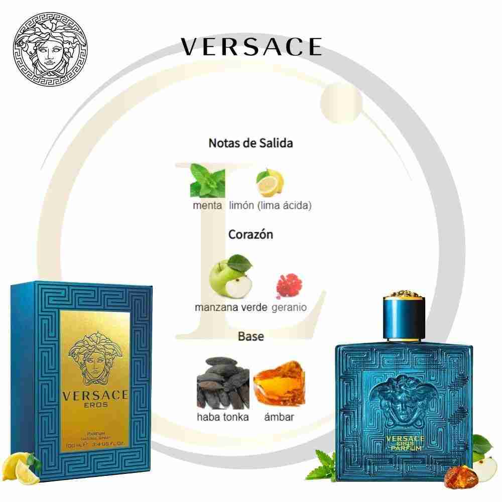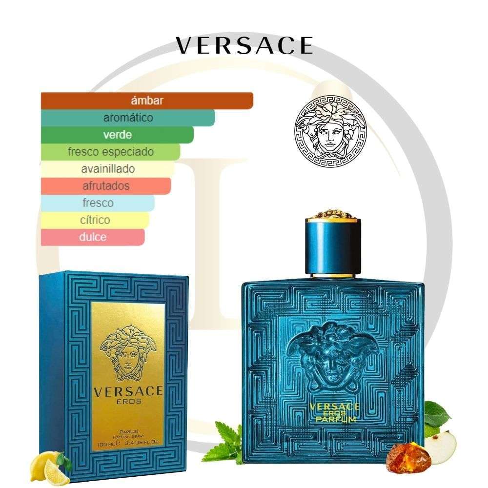 Eros Parfum de Versace es una fragancia de la familia olfativa Ámbar Fougère para Hombres. Esta fragrancia es nueva. Eros Parfum se lanzó en 2021. Las Notas de Salida son menta y limón (lima ácida); las Notas de Corazón son manzana verde y geranio; las Notas de Fondo son haba tonka y ámbar.