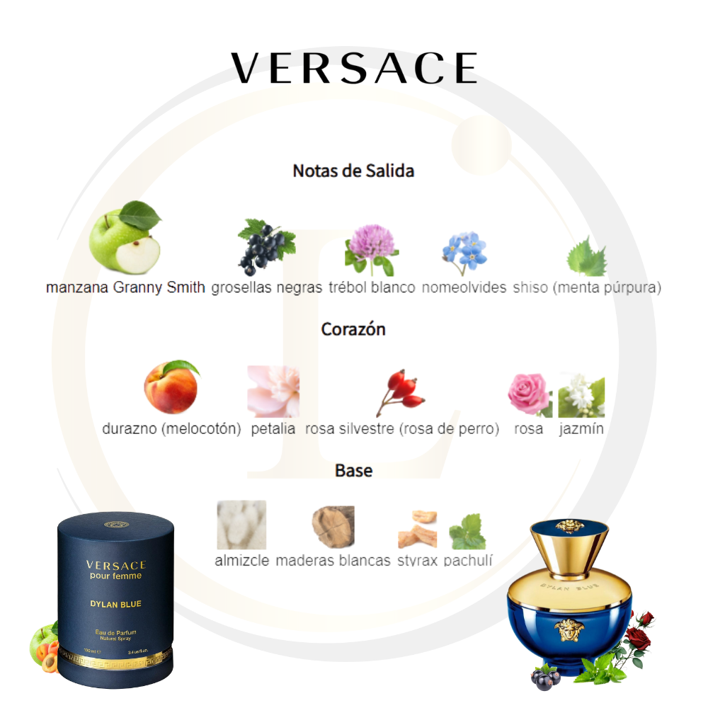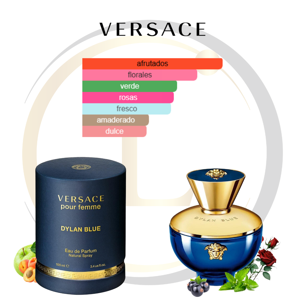 Versace Pour Femme Dylan Blue de Versace es una fragancia de la familia olfativa Floral Frutal para Mujeres. Versace Pour Femme Dylan Blue se lanzó en 2017. Versace Pour Femme Dylan Blue fue creada por Calice Becker y Natalie Gracia-Cetto. Las Notas de Salida son manzana Granny Smith, grosellas negras, trébol blanco, nomeolvides y shiso (menta púrpura); las Notas de Corazón son durazno (melocotón), petalia, rosa silvestre (rosa de perro), rosa y jazmín; las Notas de Fondo son almizcle, maderas blancas, pachulí y styrax.