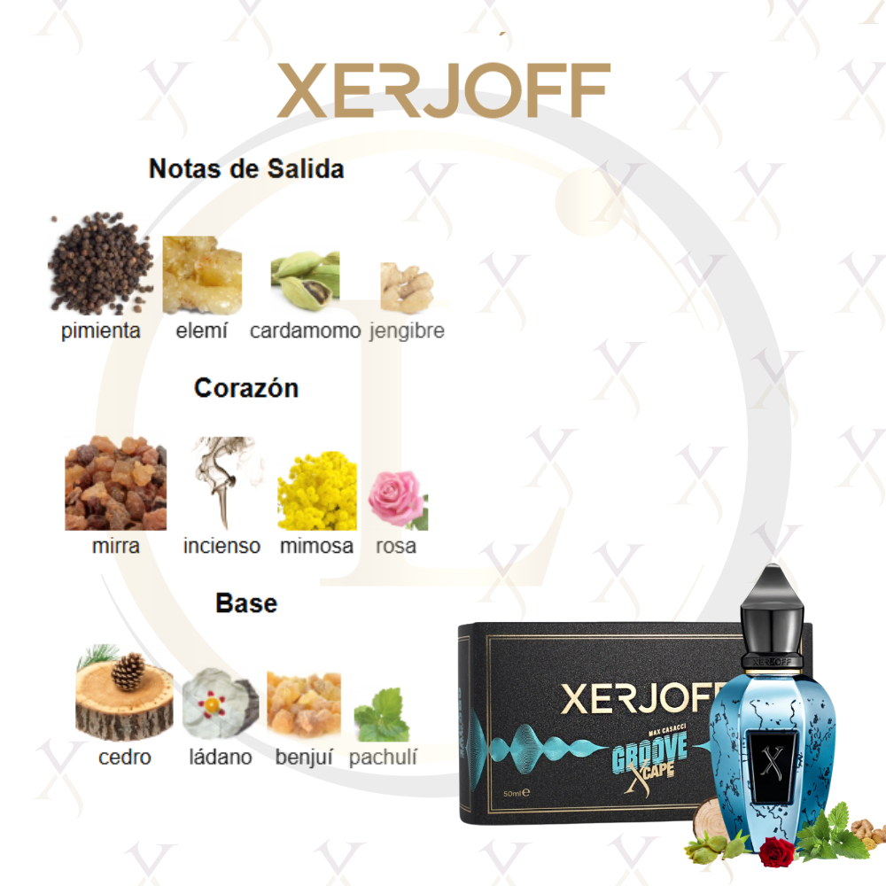Groove Xcape de Xerjoff es una fragancia de la familia olfativa para Hombres y Mujeres. Esta fragrancia es nueva. Groove Xcape se lanzó en 2023. Las Notas de Salida son pimienta, elemí, cardamomo y jengibre; las Notas de Corazón son mirra, incienso, mimosa y rosa; las Notas de Fondo son cedro, ládano, benjuí y pachulí.