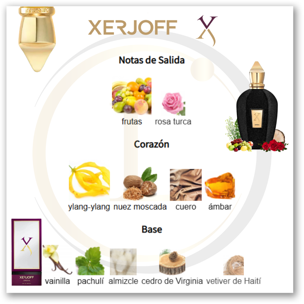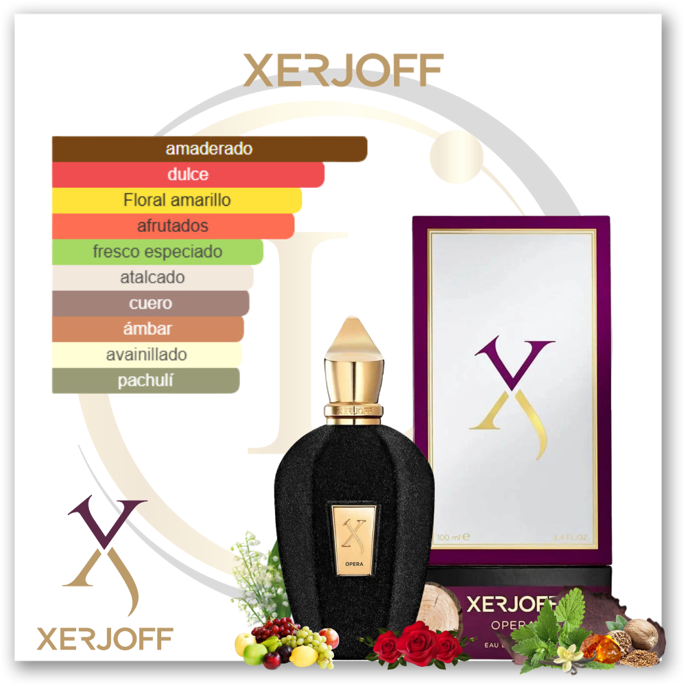 Opera de Xerjoff es una fragancia de la familia olfativa Almizcle Amaderado Floral para Hombres y Mujeres. Opera se lanzó en 2019. La Nariz detrás de esta fragrancia es Chris Maurice. Las Notas de Salida son frutas y rosa turca; las Notas de Corazón son ylang-ylang, nuez moscada, cuero y ámbar; las Notas de Fondo son vainilla, pachulí, almizcle, cedro de Virginia y vetiver de Haití.